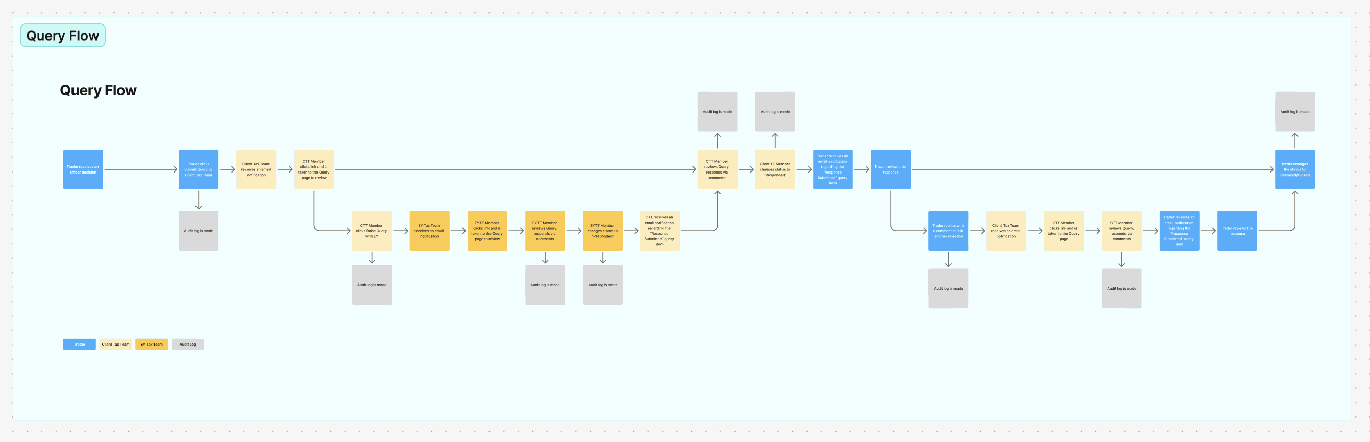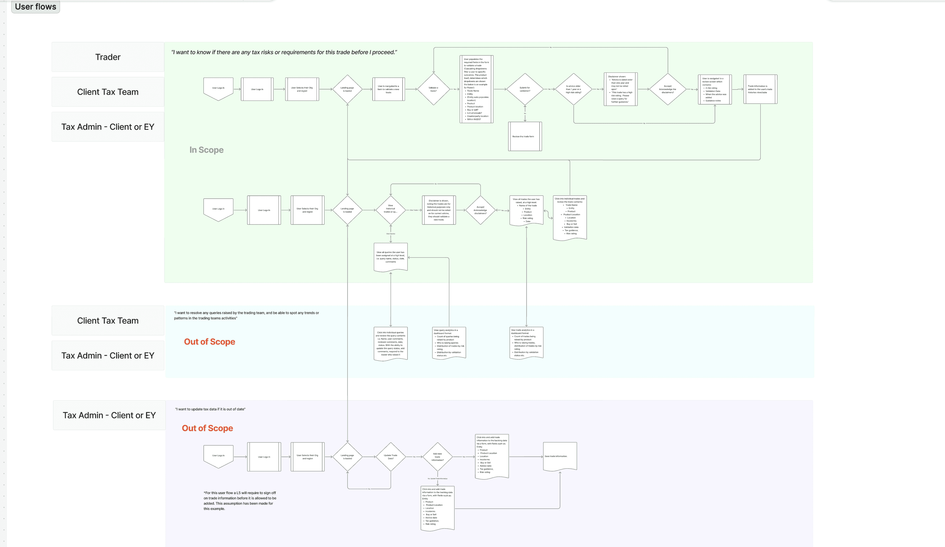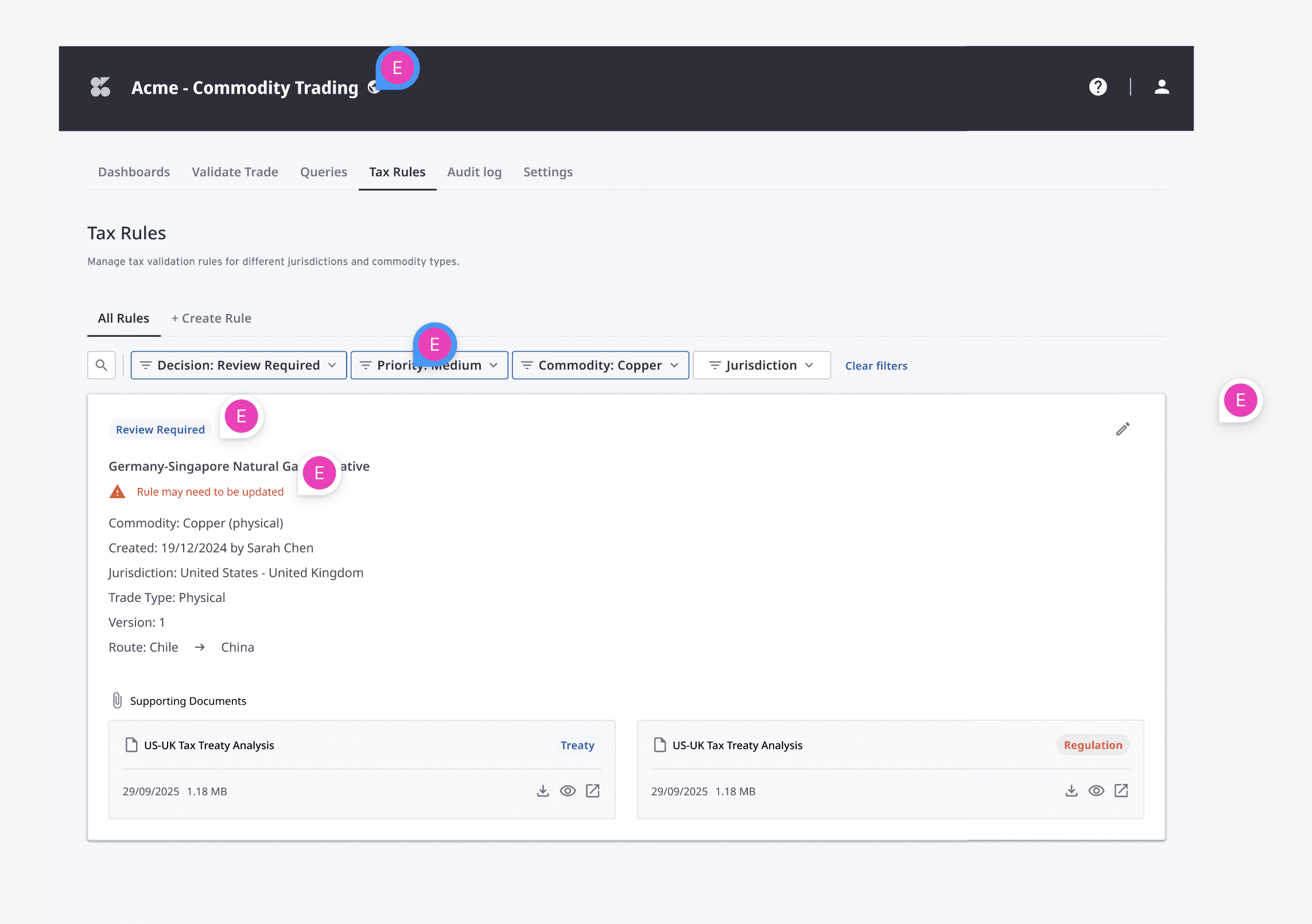Key decisions included how to surface risk ratings clearly without overwhelming the trade list view, how to structure the Tax Rules interface so that filtering across jurisdictions and commodity types feels intuitive, and how to design the query flow to route complex scenarios efficiently between the trader and the tax team without losing context along the way.