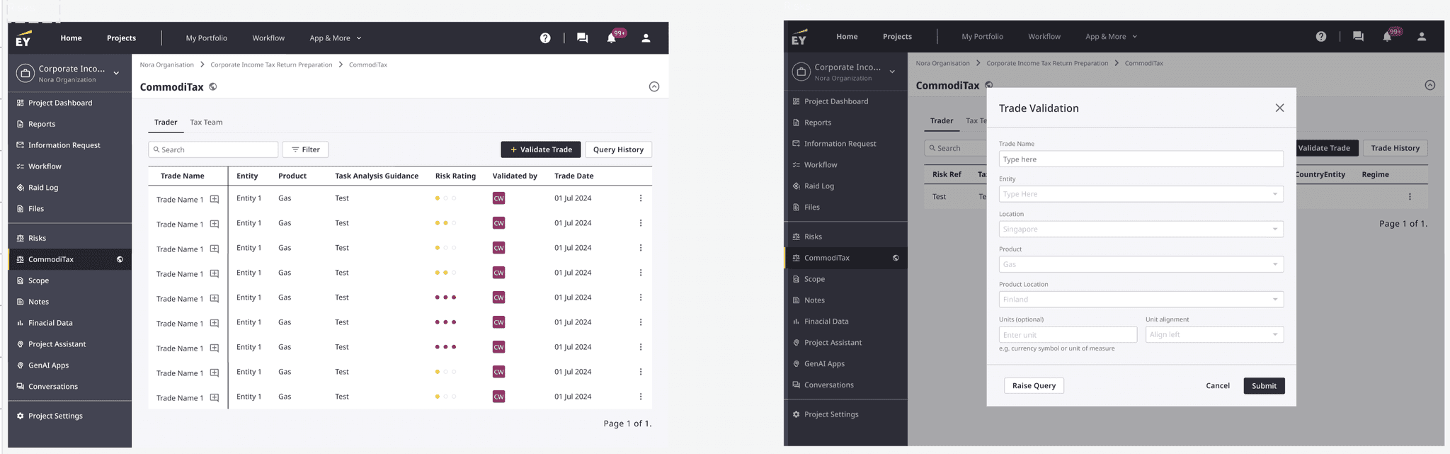 To deliver a Platform-native tool for commodity trading clients that enables traders to validate the tax treatment of cross-border commodity trades in real time, and route complex scenarios to internal or EY tax teams. The tool should improve the speed of trade approval, reduce tax risk, and create an auditable record of tax logic and decisions.