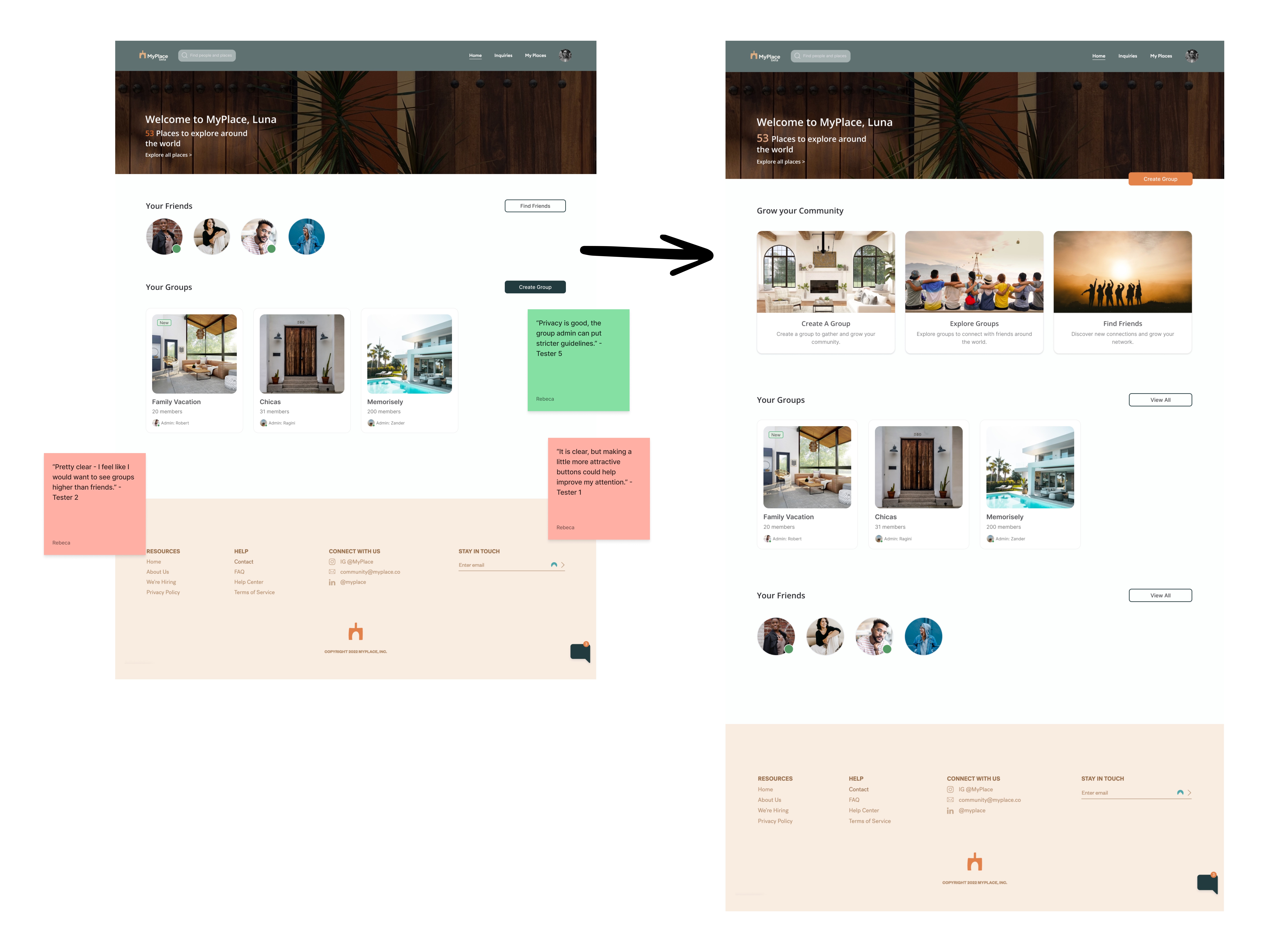 My teammate and I created a simple structure that flowed for individuals to develop their groups on MyPlace. We created a solution that satisfied the business need but addressed users' concerns around privacy. For the solution, we leaned into simplicity, creating a straightforward, pleasant experience that was relevant and smooth.